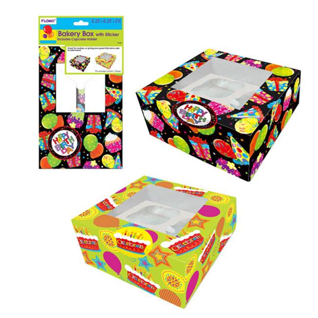 Flomo BX866 6.25 x 6.25 x 3 H in., Birthday Cupcake Box With Sticker & Cupcake Holder For 4, 2 Designs Count, Case of 72