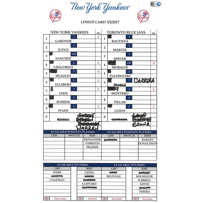 Steiner Sports 2017NYYLIU000084 Toronto at Yankees 7-5-2017 Game Used Line-Up Card