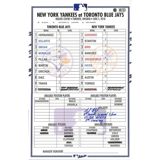 Steiner Sports ANDULIS000001 Miguel Andujar Signed Yankees at Blue Jays 6-5-2018 Game Used Line-Up Card - Toronto Version with 1st Career Grand Slam vs TOR, 6-5-2018, 7th Inning Insc.