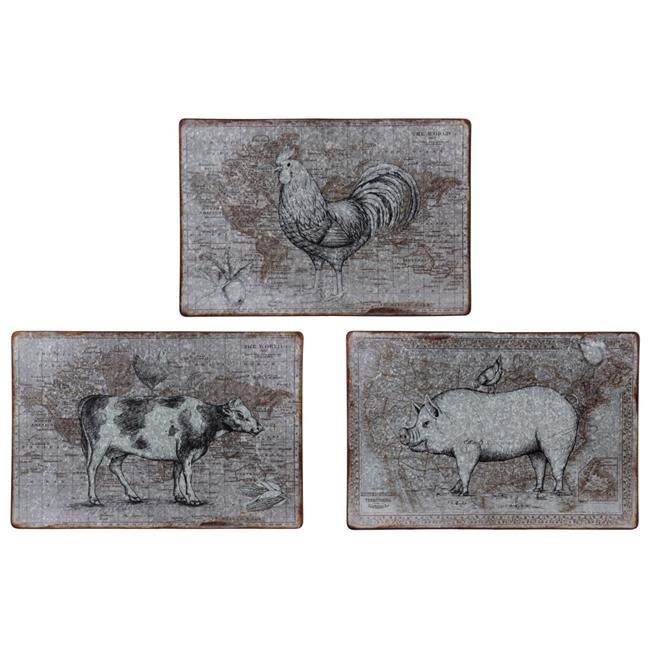 Urban Trends Collection 55810-AST Metal Rectangle Wall Decor with Farmhouse Theme Painting, World Map Background & Rusted Design Edges - Pig, Rooster & Cow - Assortment of Three Galvanized Finish - Gray