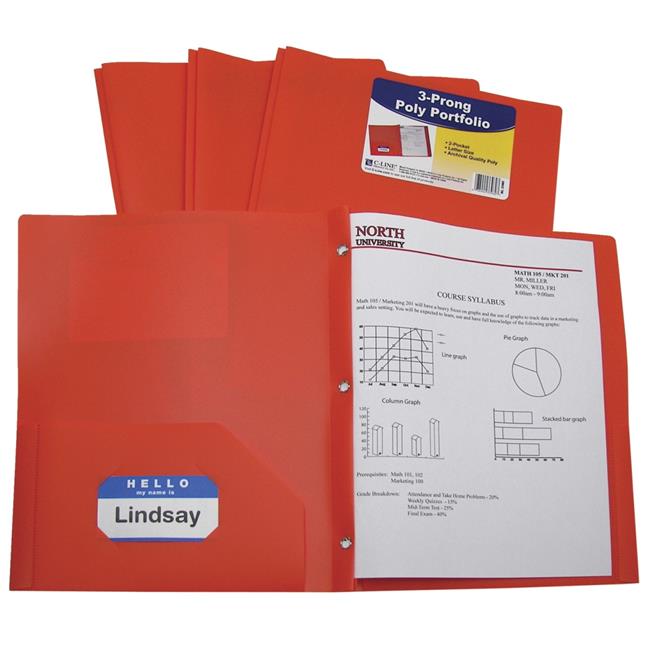 C-Line Products 1597280 Two-Pocket Heavyweight Poly Portfolio Folder with Prongs, Red - Pack of 25