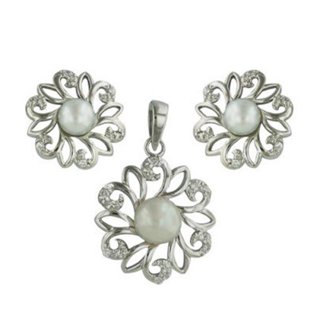 Vera & Company 8S-2017FPCL-E Sterling Silver Set Cubic Zirconia Flower Shape with Fresh Water Pearl, Clear